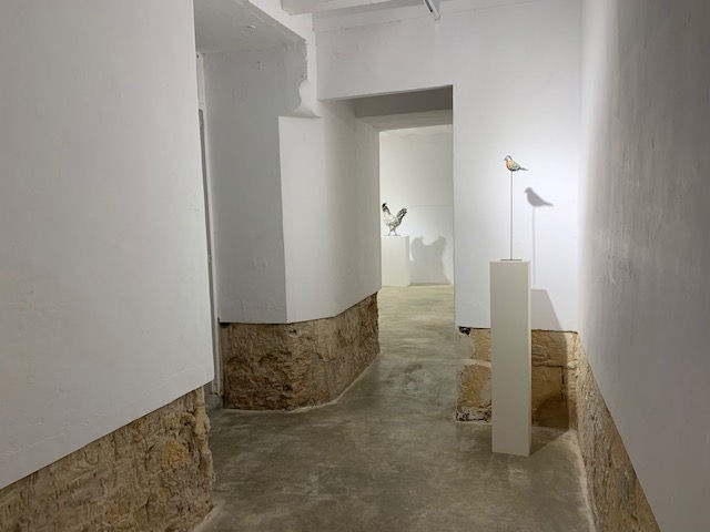 This aviary of sculptures that I present is a playful sequence of my recent animalistic work, although, in this series, I have concentrated all my work in the world of birds to imagine them weightless and flying; lonely, vigilant and multicolored. All of them are born with an iron soul and a hard mortar body that is covered with the polychrome plumage of the comic paper. It is then when that little bird, or the rooster, or the parrot are shown as a chaotic and colored mosaic of paper brushstrokes, where characters and myths are mixed, where the monsters live with the invincible hero.